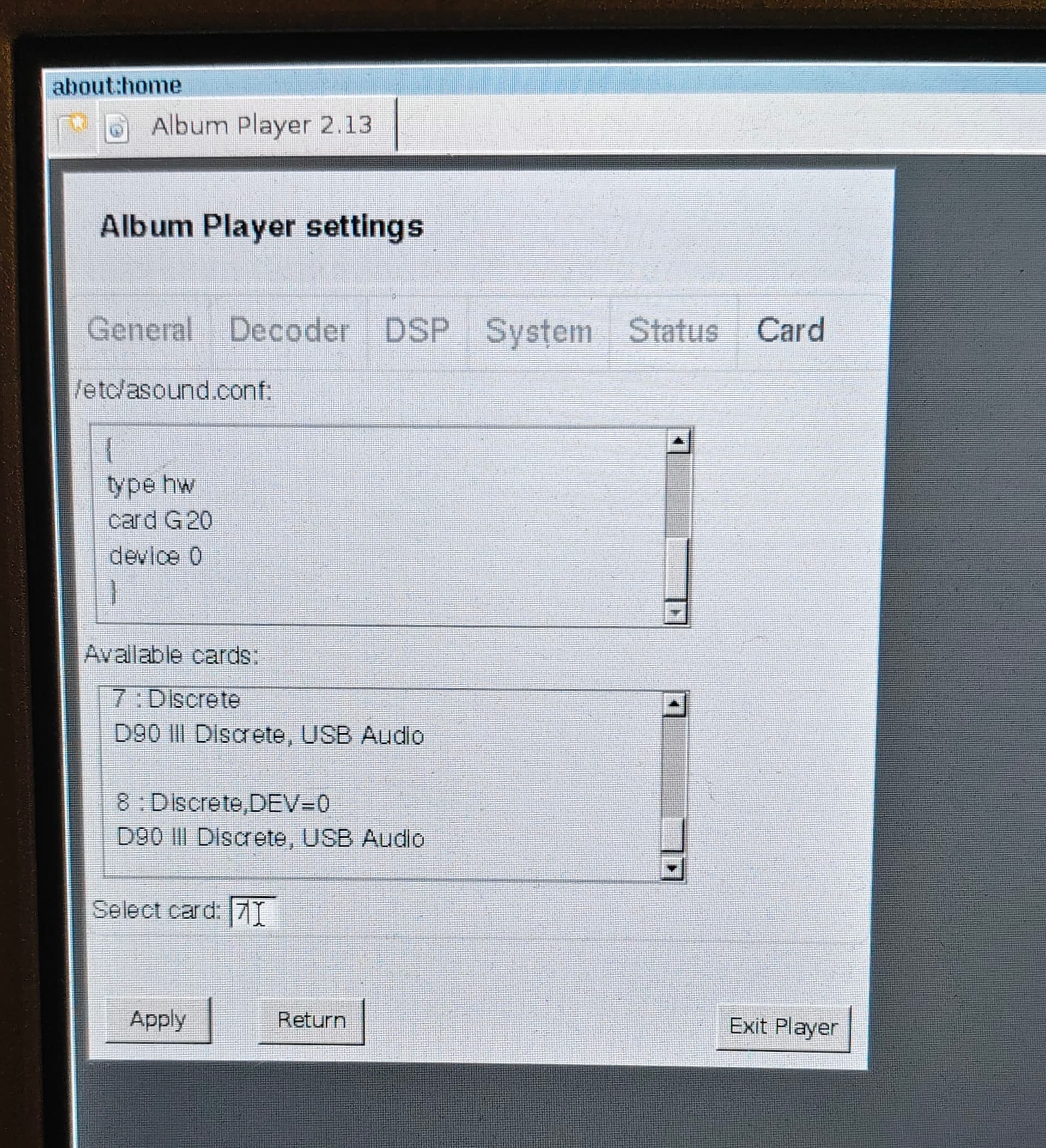 Я парень олдскульный, поэтому сборка Tiny AP (Aplayer) с ядром без сети, на ноутбуке WiFi кнопкой отключaется. Никаких берегов, стримингов и пр. Все это – на телефоне и хватит. Подключение по ЮСБ, Тини увидела ЦАП без проблем, воткнул, выбрал, заиграло.