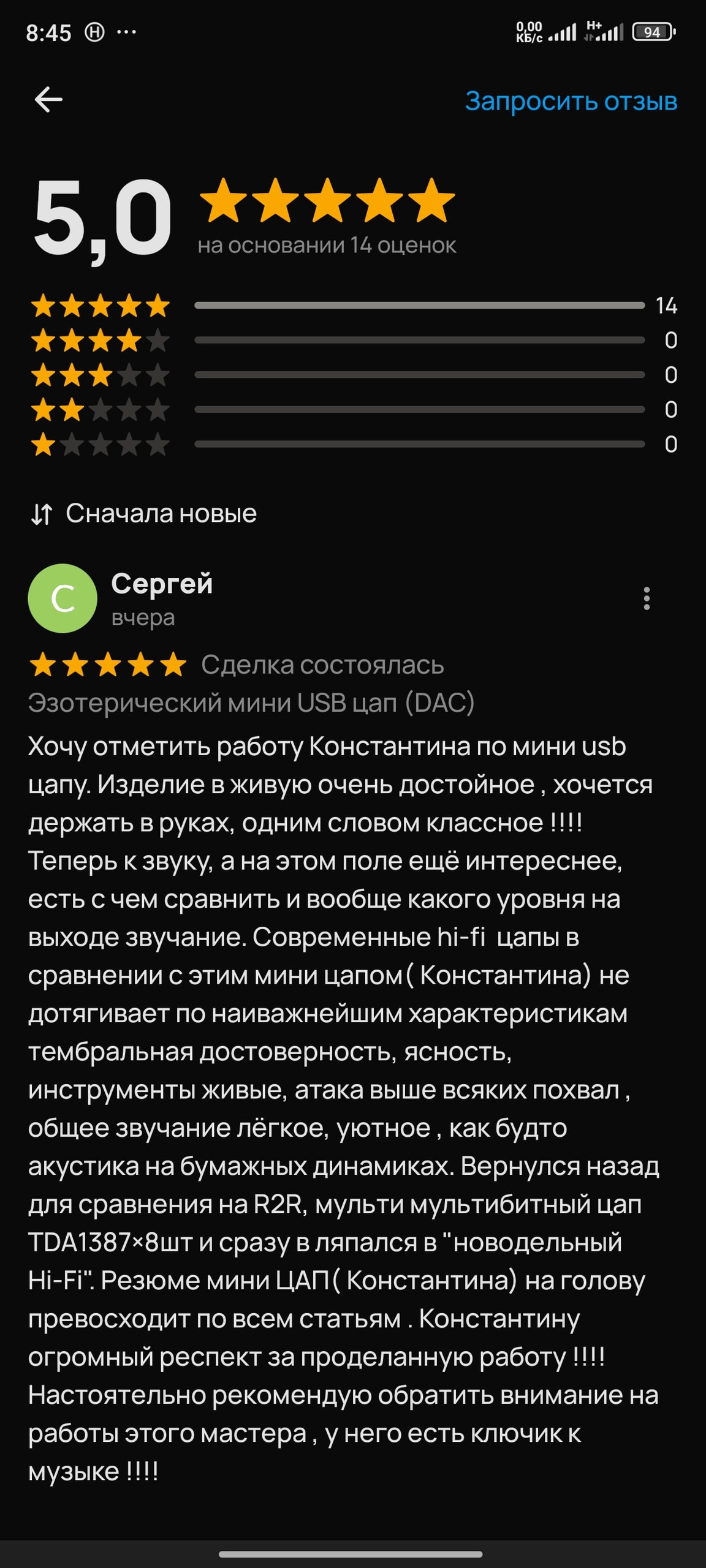 Так как отзывов покупателей на данный ЦАП в баре нет, то позволю себе скопировать отзыв из Авито