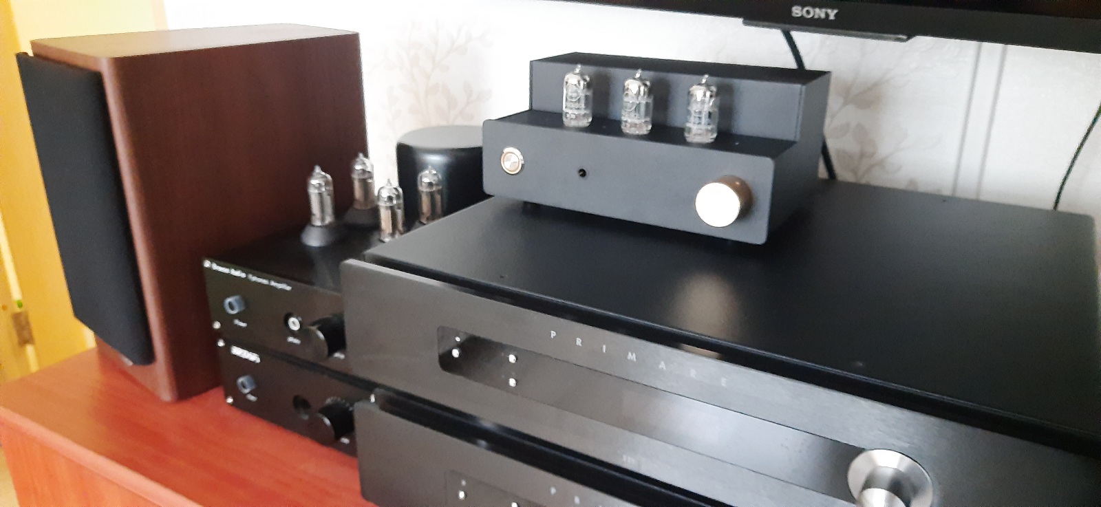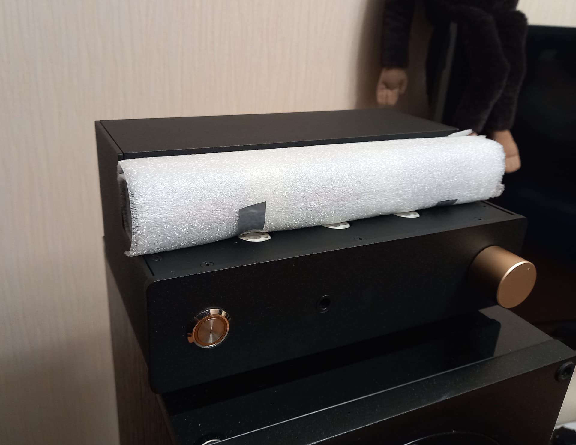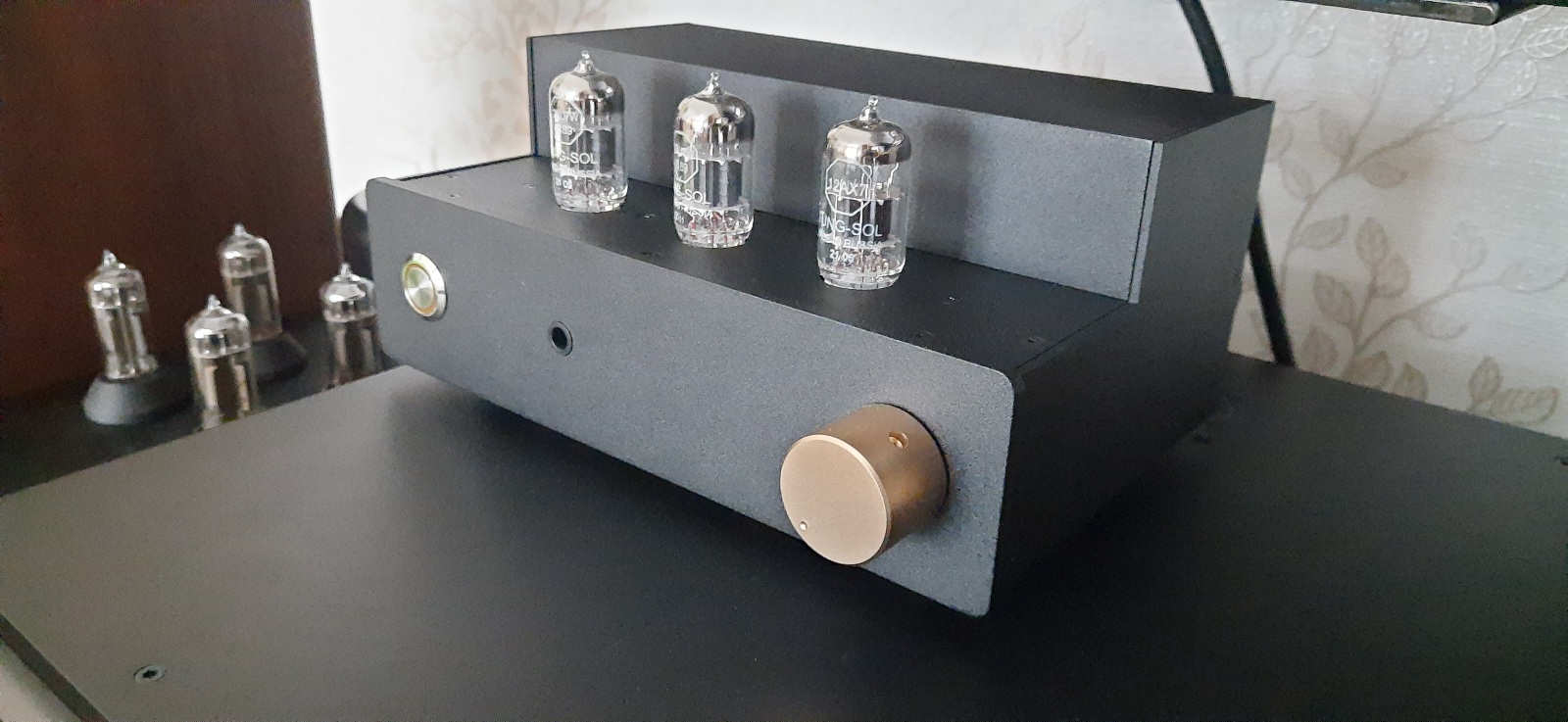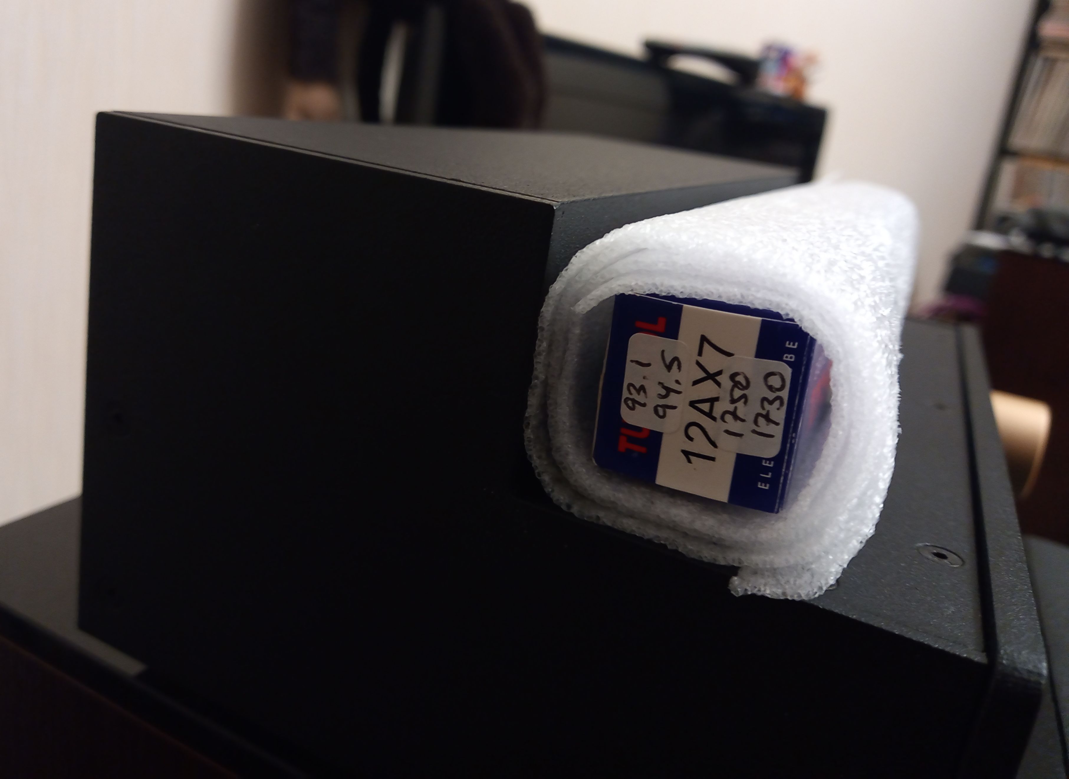 Думаю излишне напоминать, что техника нежная, хрупкая, и обращаться надо с ней аккуратно. Лампы устанавливать в панельки аккуратно но уверенно , строго по своим местам - 12AX7 на вход, это панелька справа, рядом с регулятором громкости, а в оставшиеся две панельки 12AU7, без разницы какую куда. Отправлять следующему слушателю надо со снятыми лампами, упакованными так как оно сделано сейчас. Вот как это выглядит: