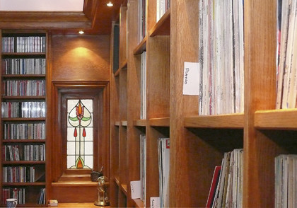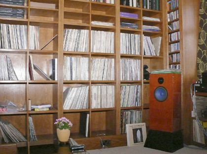 Личная коллекция пластинок занимает две стены большой комнаты от пола до потолка