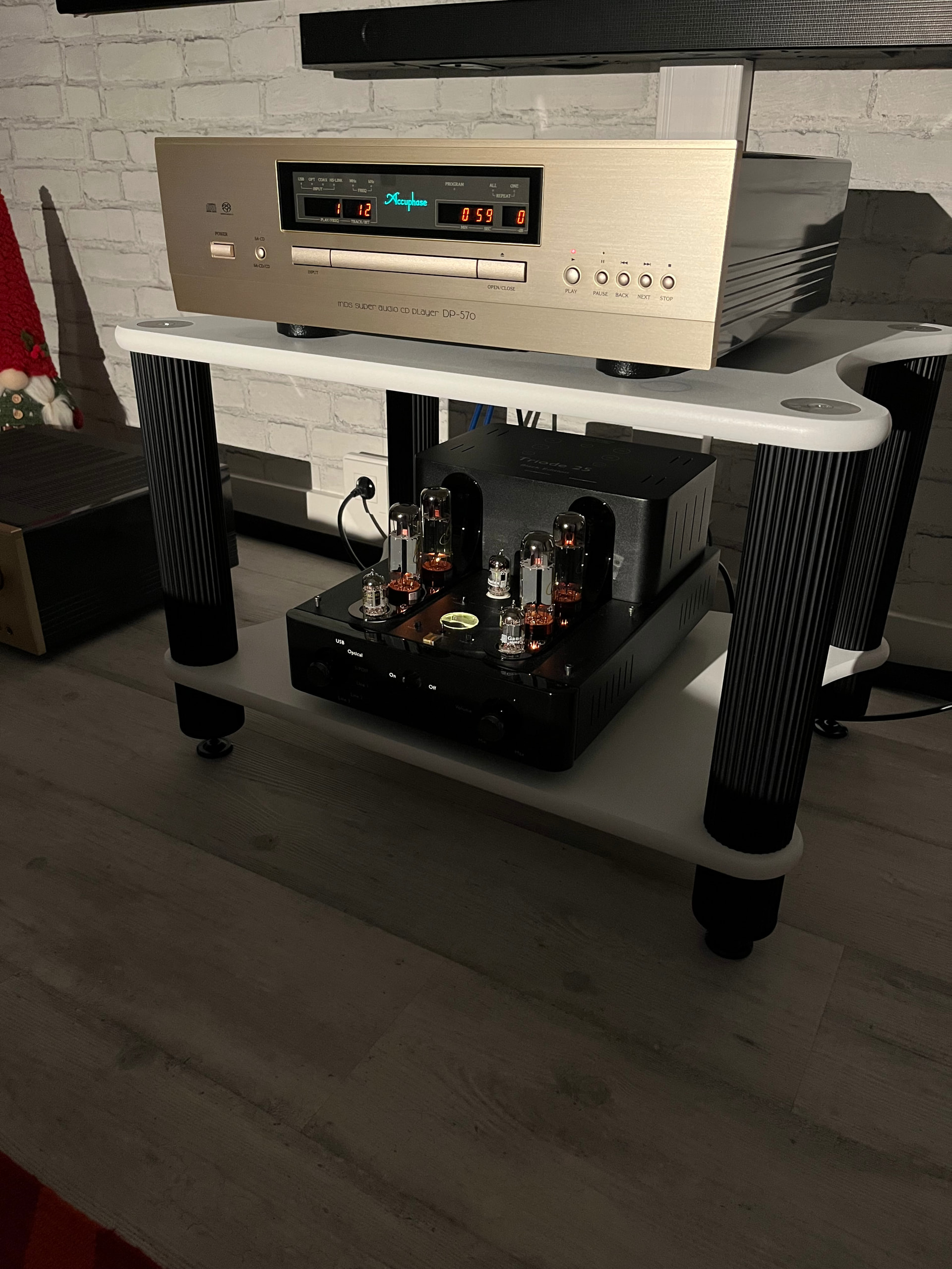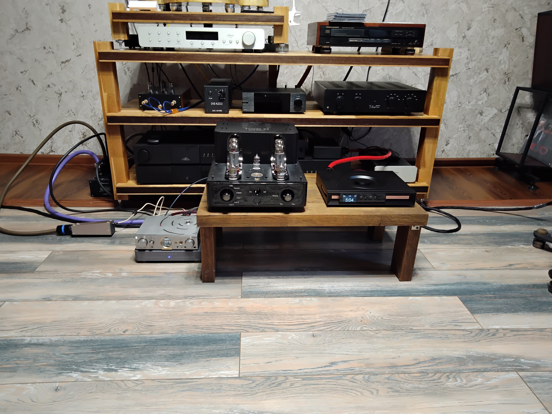 Распаковал, и печаль… Не могу место в стойке выделить. Вниз не поставишь, лампы, подстройка, тумблера. Наверх, длины акустических проводов не хватает. Вышел из положения, выделив отдельный трон!