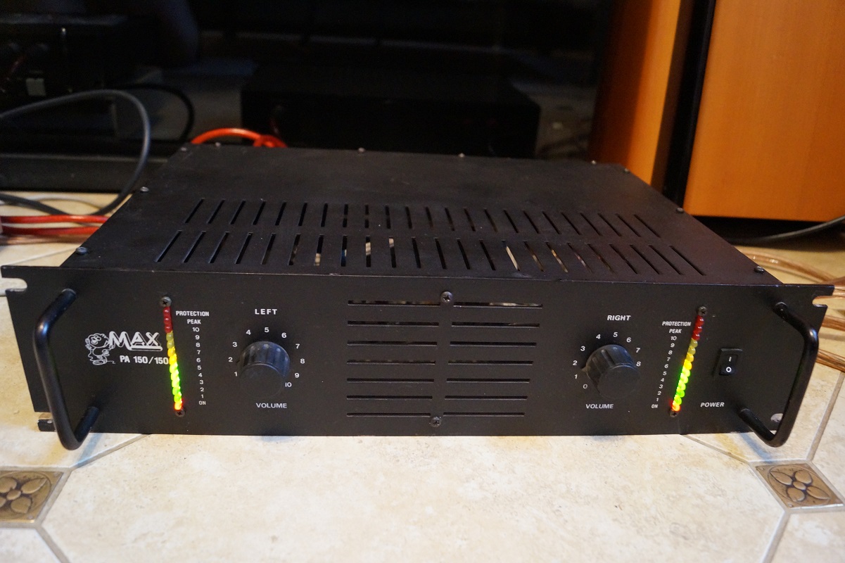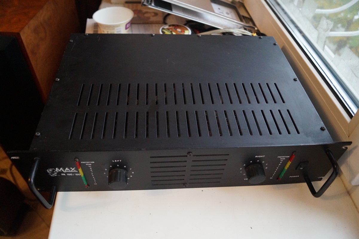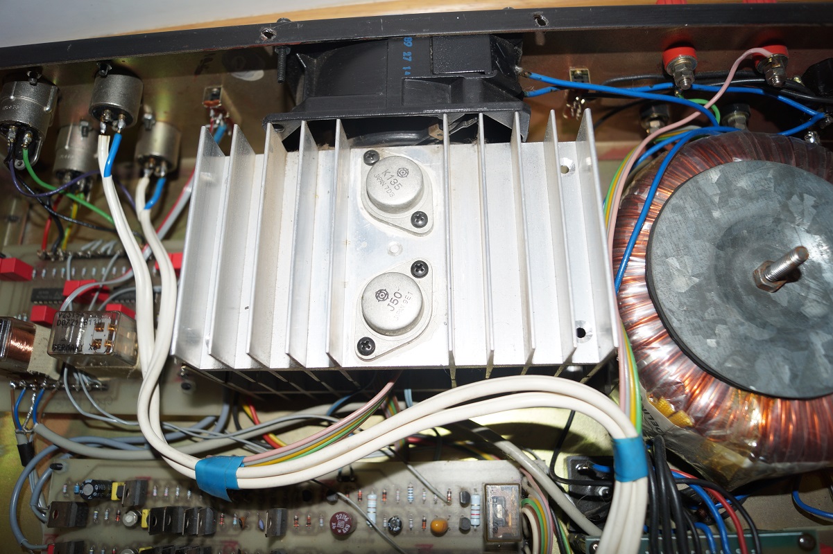 Сделан на хороших комплектующих - конденсаторы в питании две большие синие банки Al-Elko (Siemens), они под малой платой, реле Siemens, выходные транзисторы - японские хитачиевские пары мосфетов K135/J50.