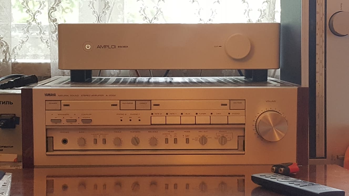 Очень понравилось фото-ретроспектива: похожая цветовая гамма усилителей, наличие ручки громкости - а дальше контраст поколений. Обилие кнопок Ямахи - и минимализм Сайбера