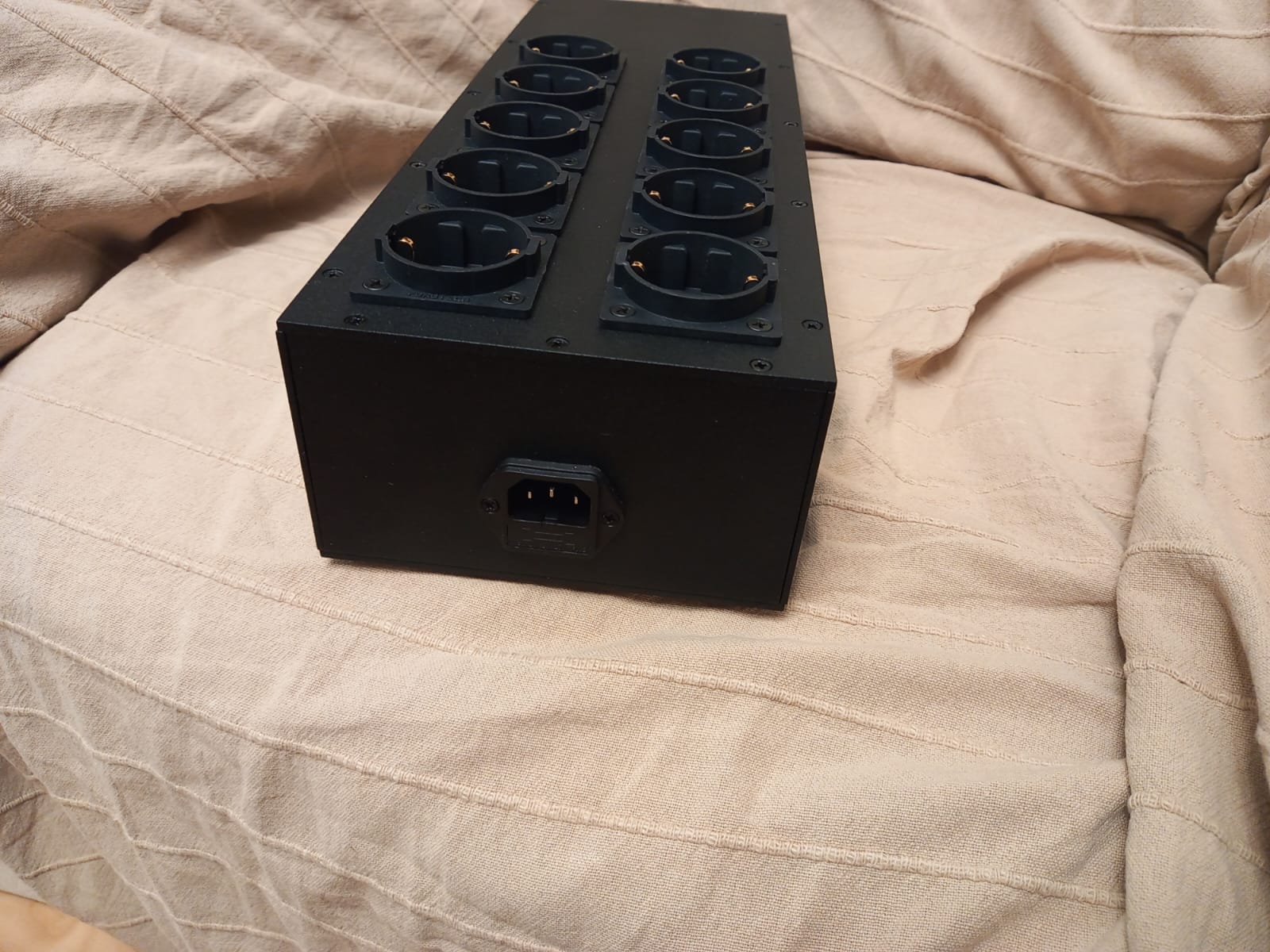 Давно хотел попробовать добавить в сетевой фильтр нечто типа “дроссельного подавителя постоянки”, как это делают некоторые наши разработчики. А тут как раз подвернулся подходящий дроссель, и я собрал довольно крупную консоль на 10 розеток: