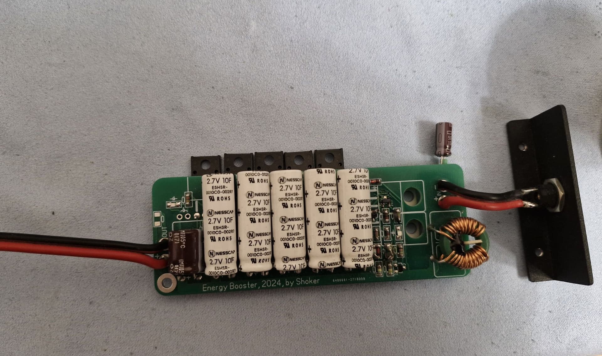 Модуль содержит 5 конденсаторов по 10 фарад включенных последовательно для работы с напряжениями до 12 вольт. Итого эффективная ёмкость 2 фарады.