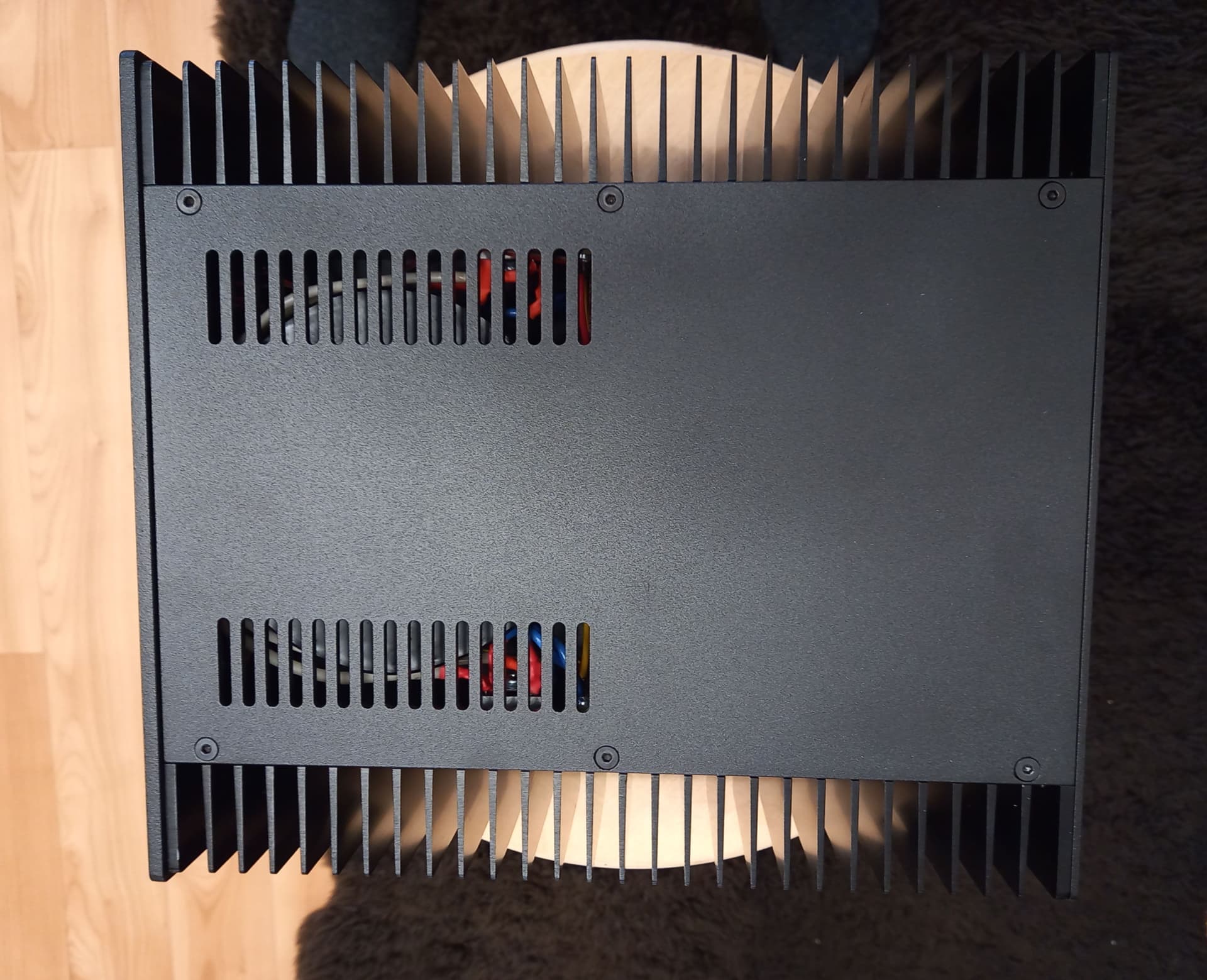 Корпус сделан кастомный, на базе пары крупных радиаторов. Энергоёмкость каждого канала - 72000мкф, всего получается 144000мкф. Чтобы это всё мягче включалось установлена плата софт старта. Причём БП по сути включен постоянно, а кнопка выключения на передней панели отключает только саму схему. Всё это позволяет не дёргать лишний раз сетевой предохранитель, выпрямители, и т.п. В схеме стоят по 3 двухсотваттных полевика в каждом канале, причём минимальный перепад с которым схема адекватно работает состовляет порядка 0,7в, что делает её довольно экономичной на больших нагрузках. Есть подстройка выходного напряжения, можно выставить от 12в до 19в. Естественно присутствует электронная защита от КЗ, настроенная на 12…13 ампер.