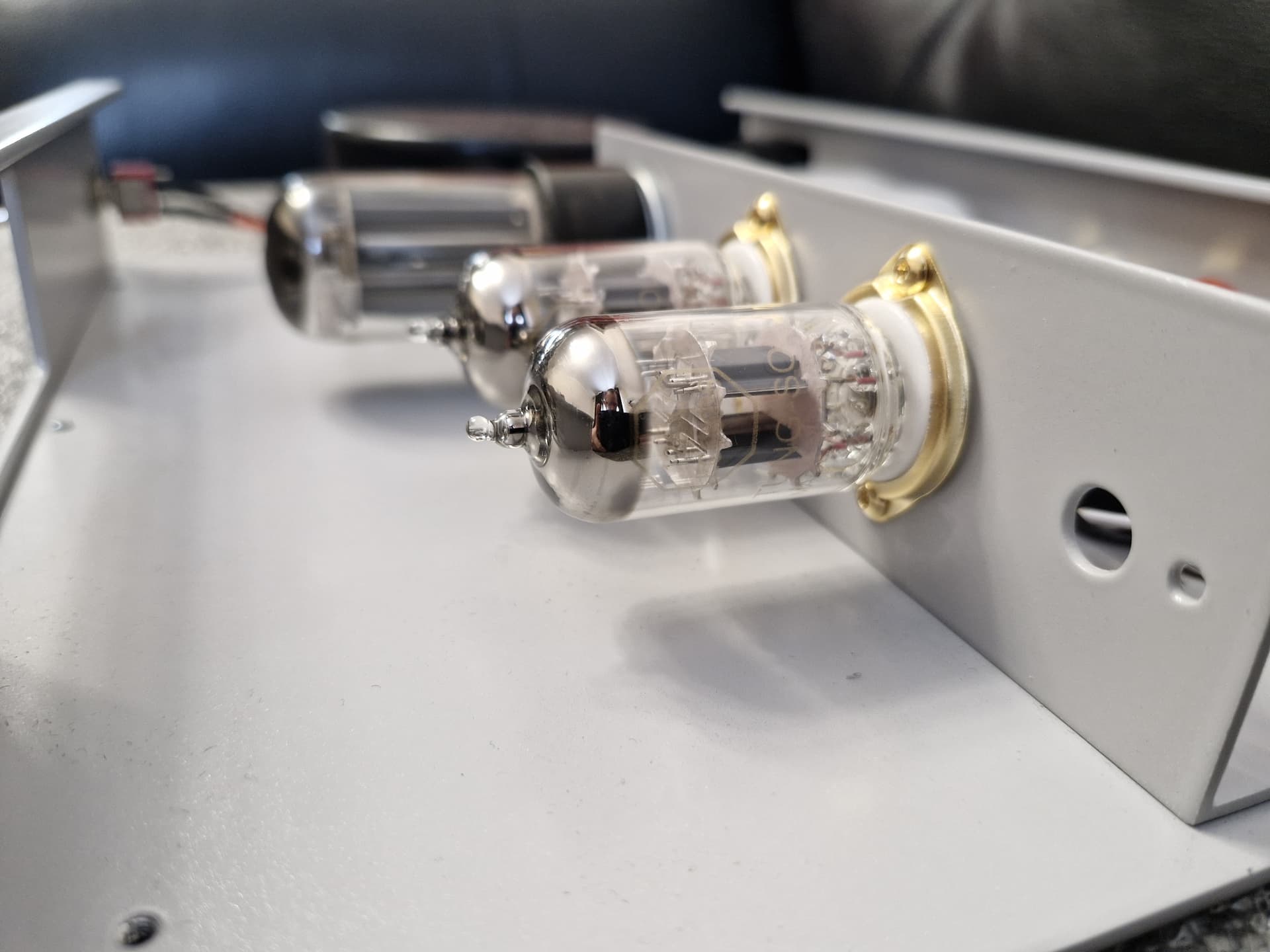 Кенотрон 5Ц4М, лампочки 12AX7 Tung-Sol с позолоченными ногами, предельно короткий тракт. Транс - тор намотанный на заказ, залит в экране.