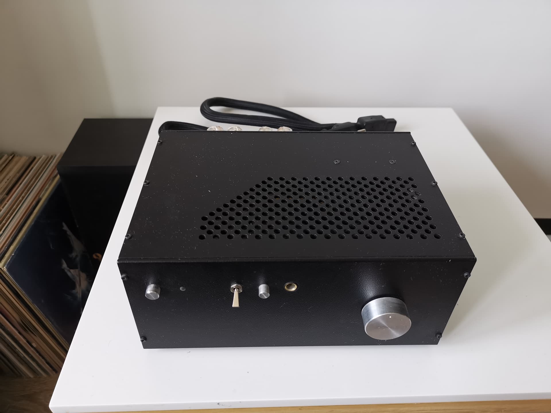Это самое продвинутое исполнение данной схемотехники. Внешний блок питания обеспечивает несколько стабилизированных линий для усилителя. Трансформатор намотан на заказ, с пониженной индукцией и экраном между обмотками, и закрыт двойным кожухом.