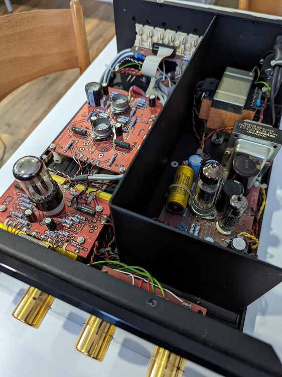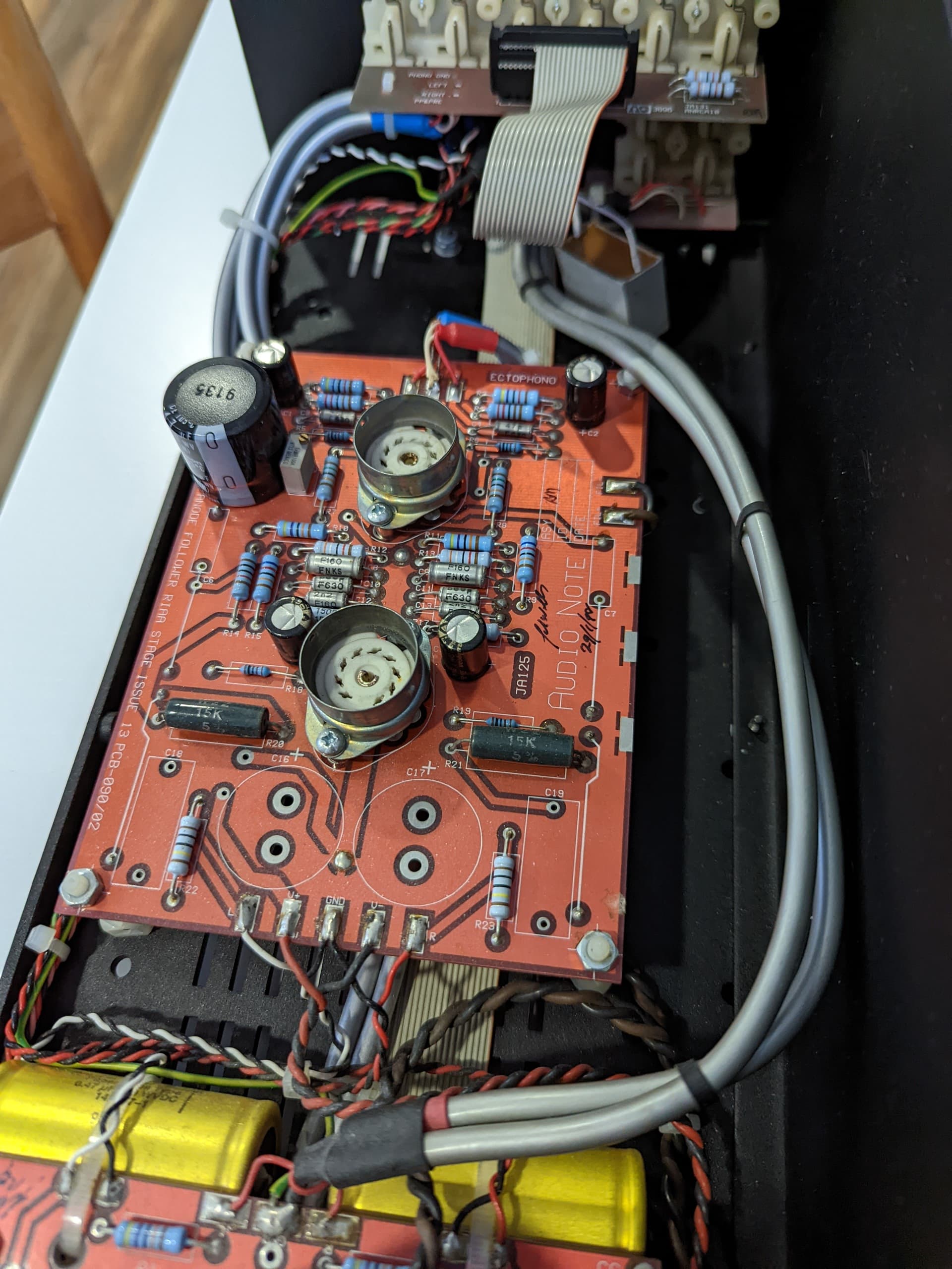 Недавно появился фон на входе фонокорректора. Раньше был практически неразличим, теперь довольно сильный. Земля тонарма на месте, без неё фон еще сильнее. Кабели тоже пробовал разные поперетыкать - не помогло. Менял лампы в корректоре 82, 83 - без изменений. Замена 6SN7 в пред секции тоже не помогла. В питании ламп у меня замены нет так что их пока не пробовал, но мне что-то подсказывает, что дело не в них.
