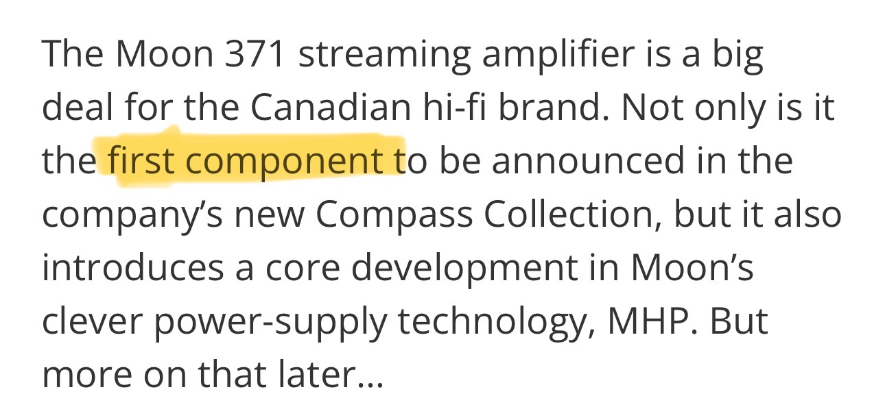 Moon убрали из линейки компоненты Mind 2 и 340iX , заменив их на Moon 371 . Эта новая модель взяла выходные транзисторы от 340iX (100 Вт / 8 Ом и 200 Вт / 4 Ом), но получила более совершенный блок питания MHP (MOON Hybrid Power) . Как заявляют в компании, они экспериментируют с питанием, в то время как многие используют стандартные решения. Задача — брать из розетки минимум, а на выходе давать максимум (вероятно, есть требования к энергоэффективности).