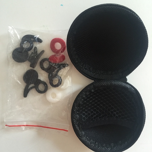 Комплект — богаче: два набора ушных крюков (даже не пробовал), белые-красные-черные поролонки и прищепка еще. У меня уже релизная версия, кабель дополнительно защищен сверху прозрачной трубкой термоусадки.