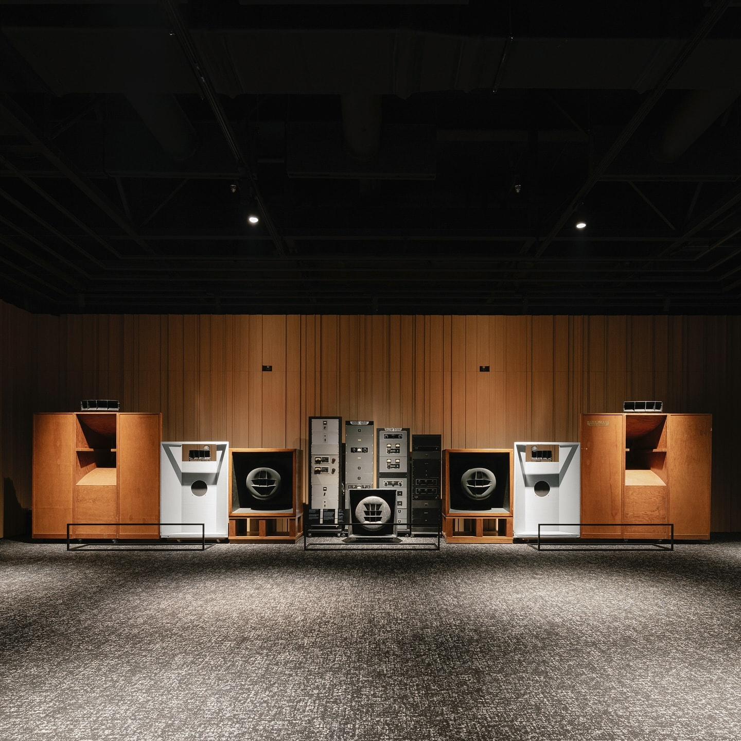 В зале представлены культовые домашние акустические системы и усилители, определившие эпоху, включая модели таких брендов, как JBL, McIntosh и Marantz.
