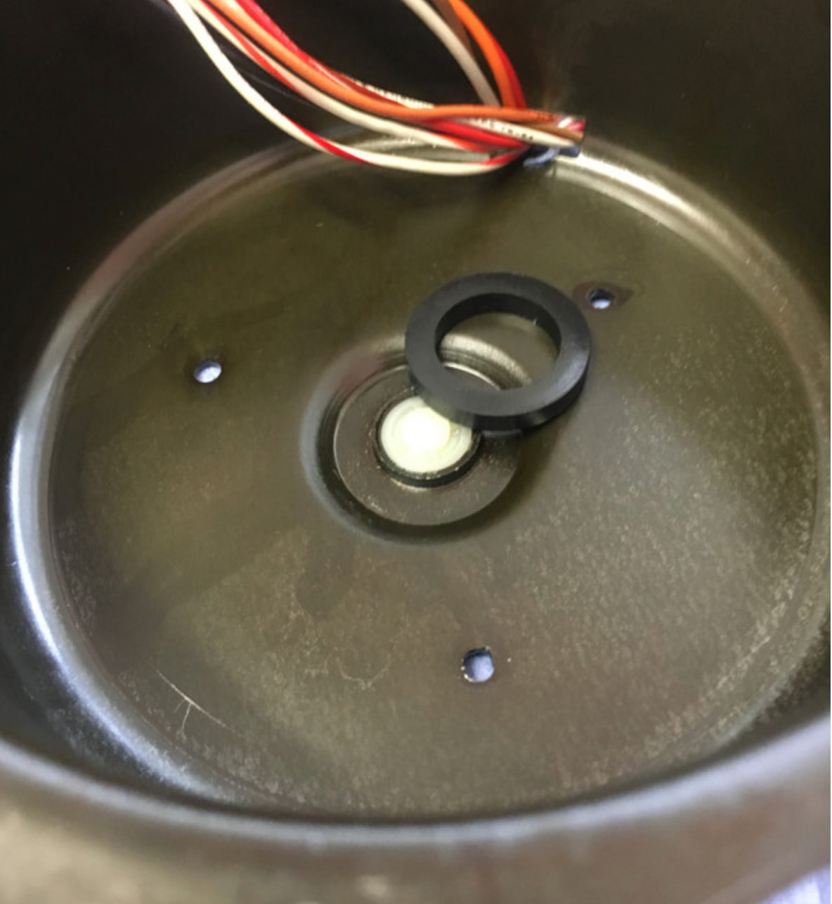 Внизу стоит пластиковая шайба, в корпусе, которая закрывает отверстие сквозное в корпусе мотора, с углублением под шарик шпинделя на кончике. И так же резиновая прокладка.