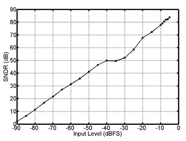 Качество модуляторов 5-го порядка, широко применяемых для записей DSD64 не пинал только ленивый (не секрет, что 10-й порядок доступен уже давно, однако там свои проблемы со стабильностью при уровне входного сигнала около 0,74Q). Известно о присущих самому принципу дельта-сигма модуляции артефактах в виде idle tones/limit cycles, равно как и о способах их нивелирования (модуляторы с дизерингом) ценой повышения шумового порога. Так же существует нелинейность отклика цап, использующих принцип Dynamic Element Matching (DEM). Например, для Signalyst DSC, где DEM реализован с помощью скользящего среднего (DWA), зависимость SNDR от уровня входного сигнала имеет следующий вид: