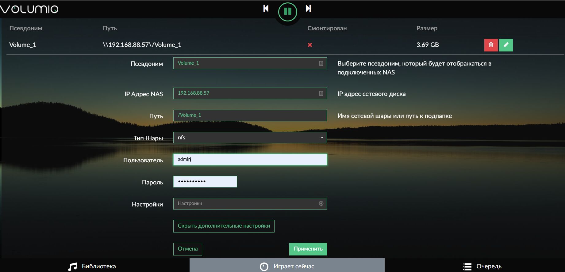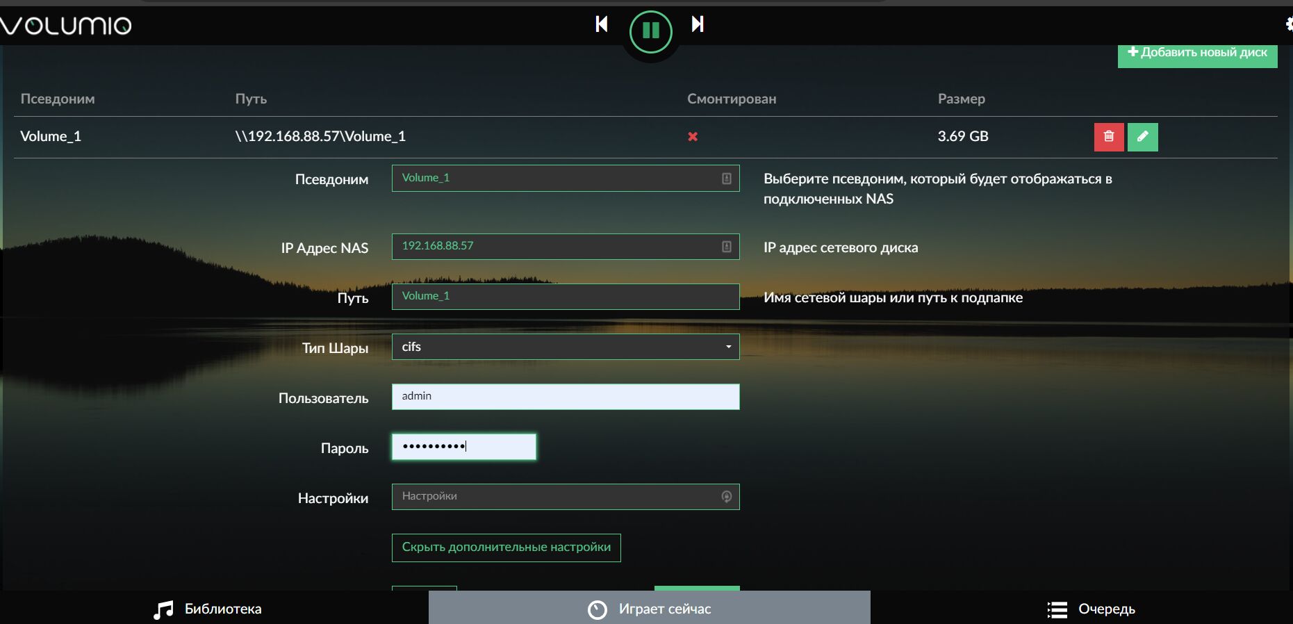 Сколько уже писали, но у меня такая же проблема с Nas: в локальной сети вижу его и могу работать с файлами, Волумио определило его, но смонтировать не может, прошу помощи!