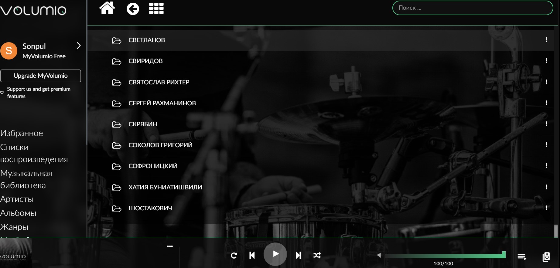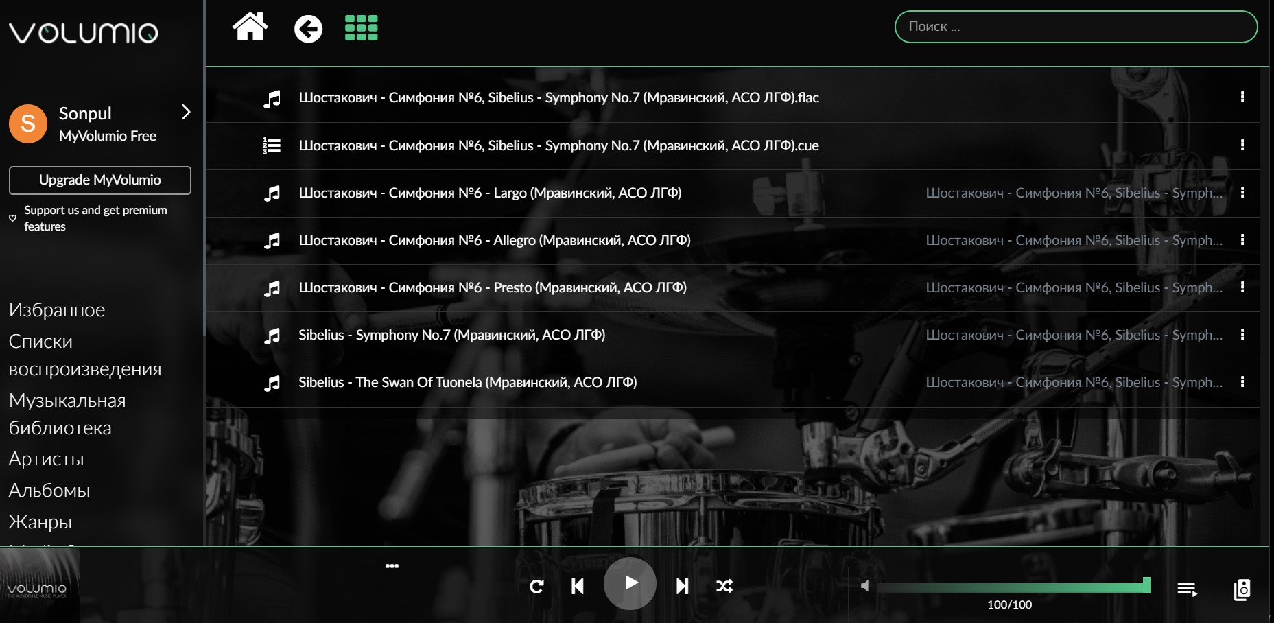 Избранное - да, всё отображается, так же как и отдельно в приложении - коннект есть. На работе приложение, дома - Volumio