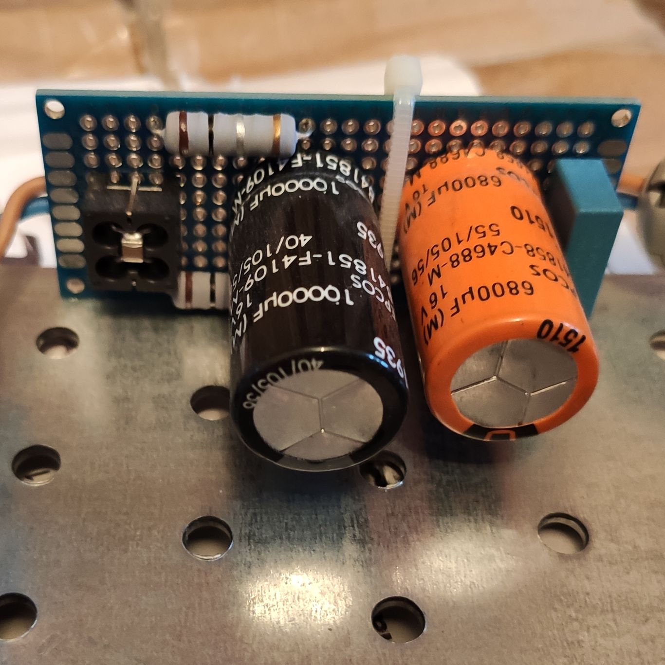 Банальная комбинация из LC и RC фильтра. В качестве LC фильтра использована murata bnx 016, в качестве RC два резистора 0,1Ом и три конденсатора последовательно, 10000мкФ общего применения, 6800мкФ с низким импедансом и плёночный МКР 0,22мкФ.