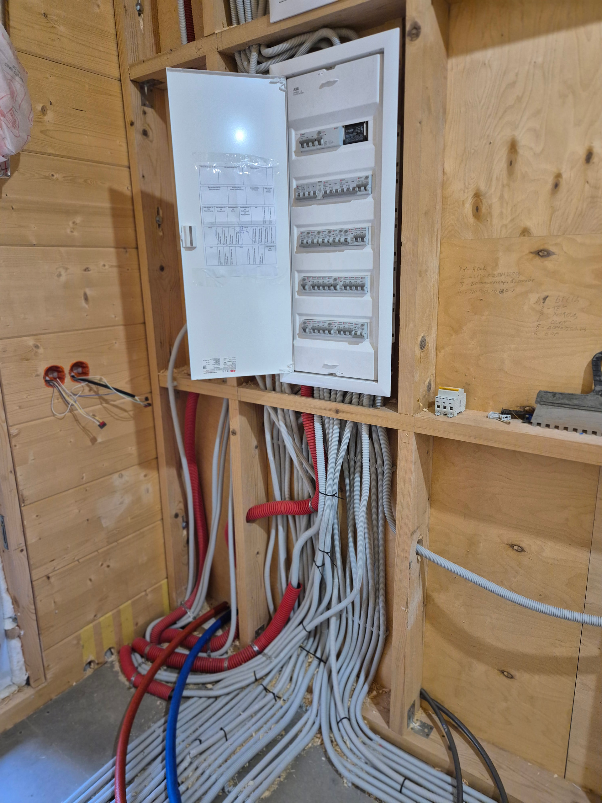 Все правильно, там где скрытая проводка внутри бруса, проводка идет в “специальной” гофре. Кроме того, там кроме электрики идет слаботочка, интернет, камеры и т.д, щит для слаботочи выше электрики. Если честно я сам когда увидел количество проводов немного…