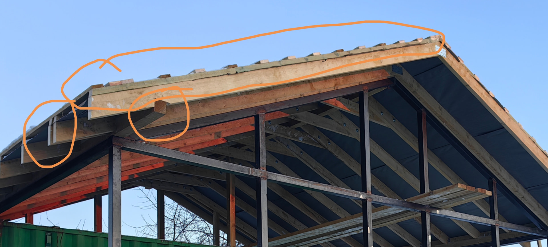 Если занудствовать, то к сожалению, это всё-таки делается не много не так( чуть бы добавить). Но думаю, что все таки, в данном варианте не критично, но пару распорок подпорок я бы поставил. Крыша не планируется к утеплению? помещение закрытое? Как Бока заделываться будут? Как воду с пленки куда отводить? и еще чуть чуть, но все мелочи, а так очень основательно.