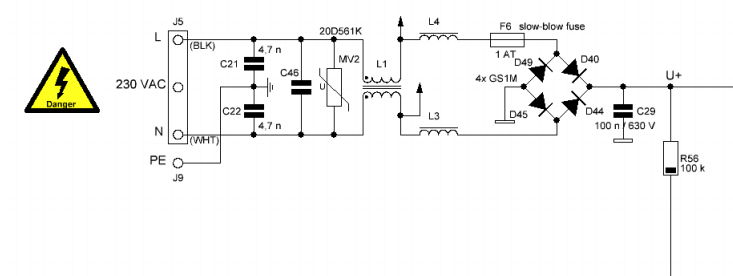 Судя по схеме на входе имееттся ЭМИ фильтр.